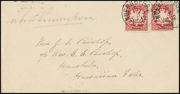 10 Pfg. per zwei auf Couvert von Nürnberg 1892 via Bremerhafen und San Franzisko nach Honolulu/Hawaii
