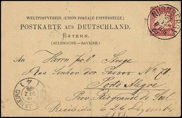Drei Belege mit verschiedenen Brasilien-Destinationen (kl. Mgl.): fleckiger Brief 1899 mit Paar 5 Pfg. (eine Eckfehler) nach Victoria, sowie zwei Postkarten 10 Pfg., früh 1883 von Nürnberg nach Porto Alegre, und 1898 nach Sao Paulo