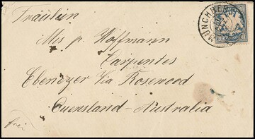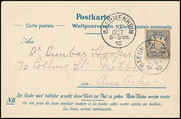 20 Pfg. hellblau auf seltener Ballon-Postkarte 1910 nach Australien (!), Karte verwendungsbedingt etwas bügig. Seltene blaue Vordruckkarte des Augsburger Vereins für Luftschiffahrt, von einem australischen Ballonfahrer aufgegeben mit entsprechendem rs. Text, vom Finder der Karte in Baeumenheim aufgeliefert nach Australien, ein sehr ungewöhnliches Poststück und seltener bayerischer Ballonbeleg!
