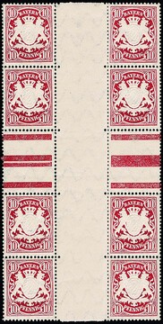 10 Pfg., sehr seltenes Herzstück aus dem großen Druckbogen, mit gesamt vier waagerechten und zwei senkrechten Zwischenstegpaaren, es soll nur noch ein weiteres Druckbogen-Herzstück dieser Marke existieren (in der Zähnung gering vorgefaltet!)