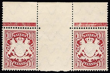 10 Pfg. rot, seltenes postfrisches waagerechtes Zwischenstegpaar (in der Zähnung etwas gefaltet) aus unzertrenntem Druckbogen