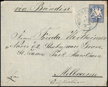 20 Pfg. blau einzeln auf Couvert (min. Gebrauchsmgl.) von Nürnberg nach Melbourne/Australien 1895