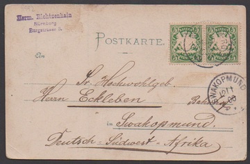 5 Pfg. im Paar auf Ansichtskarte 1899 aus Nürnberg (leichte Gebrauchsspuren) nach Swakopmund/DSWA