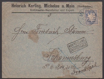20 Pfg. einzeln auf ungewöhnlichem Brief (fleckig) von Michelau nach Johannesburg/Transvaal (Südafrika), Juni 1900, dort nicht zustellbar und vier Monate später wieder in Michelau angekommen