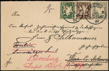 3, 5 und 2 Pfg. auf Brief von Ansbach 1900 an einen Zahlmeister-Aspiranten bei den Deutschen Schutztruppen in Dar-es-Salam/Deutsch-Ostafrika, dort nicht zustellbar und über das Auswärtige Amt in Berlin wieder zurückgesandt, leichte Gebrauchsspuren