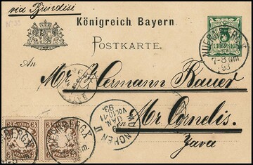 3 Pfg. braun per zwei auf Ganzsachenkarte 5 Pfg., von Nürnberg 1893 nach Java (heute Indonesien) gelaufen