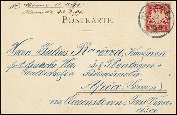 10 Pfg. einzeln auf Postkarte (im Adressfeld leichte Rauhung) von München 1898 nach Apia/Samoa, 28.000km entfernt und für Bayern eine sehr seltene Destination!