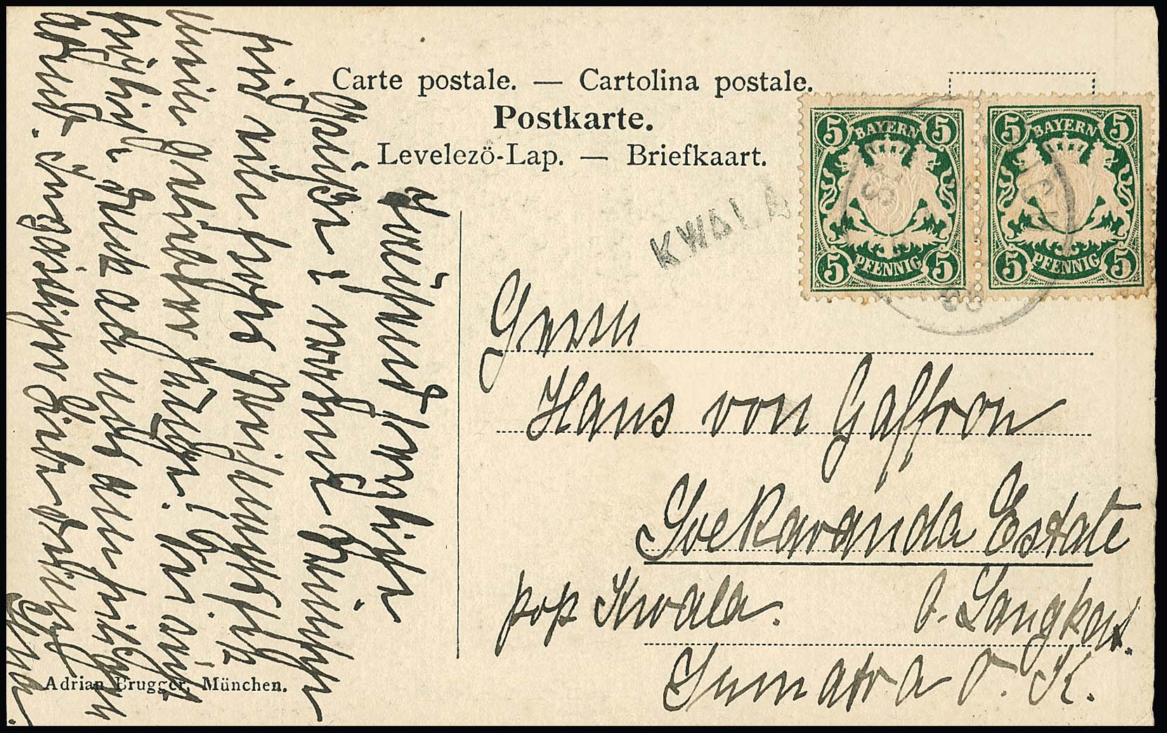 5 Pfg. im Paar (kl. Zahnfehler) auf Postkarte (rs. gedruckte Zeichnung der bekannten Künstlerin Margarethe von Gaffron mit eigenhändigem Monogramm) 1903 nach Soekarande Estade, Sumatra, seltene Destination!