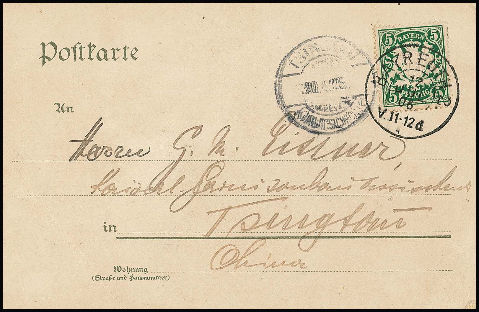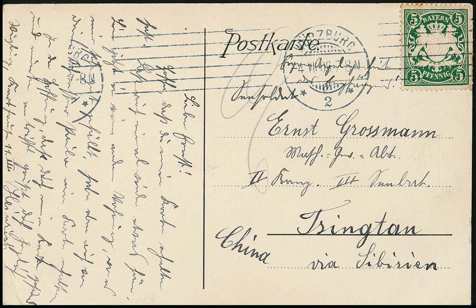 5 Pf. (kl. Zf.) einzeln auf Ansichtskarte 1908 von Würzburg nach Tsingtau/Kiautschou