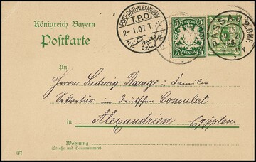 5 Pfg. auf Ganzsachenkarte 5 Pfg., 1906 von Passau nach Alexandrien/Ägypten an einen Botschafts-Sekretär
