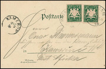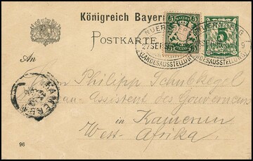 5 Pfg. auf Ganzsachenkarte 5 Pfg., 1896 mit SST von der Nürnberger Landesausstellung an den Assistenten des dortigen Gouverneurs in Kamerun