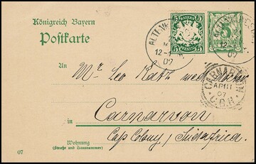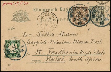 5 Pfg. auf Ganzsachenkarte 3 neben 2 Pfg., 1910 von Würzburg nach St. Faith in Natal/Südafrika gelaufen (leichte Gebrauchsspuren). Sehr seltenes kleines Dorf in der Gemeinde Uzumbu/Kwazulu-Natal an einen Pfarrer in der dortigen Trapisten-Mission