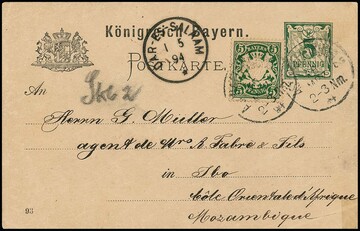 5 Pfg. auf 5 Pfg. Ganzsachenkarte (re. unten kl. Klebestelle wg. Eckbuges), von Aschaffenburg 1894 über Dar-es-Salam/Deutsch-Ostafrika nach Ibo, einer Halbinsel in Mozambique (portug. Kolonie). Sehr seltene Destination!