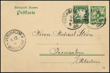 Zwei Ganzsachenkarten jeweils nach Jerusalem/Palästina, einmal mit Paar 5 Pfg. 1899 über das dortige Österreichische Postamt (Mgl.), sowie 1908 von Fürth, jetzt über das Deutsche Postamt in Jerusalem