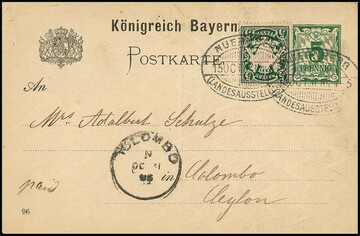 5 Pfg. auf Ganzsachenkarte 5 Pfg. (mit rs. Zudruck), 1896 mit SST von der Landesausstellung Nürnberg nach Colombo in Ceylon gelaufen, selten!