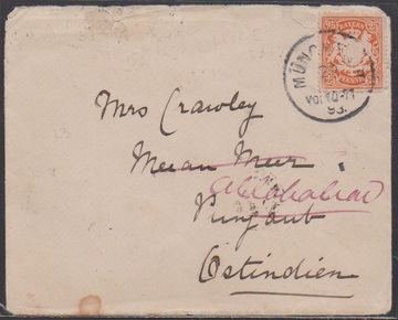 25 Pfg. einzeln als Fehlfrankatur auf Couvert von München 1893 nach Punjab in Indien (rs. Seepost- und Militär-Stations-Stempel) mit inländischer Weiterleitung, etwas fehlerhaft