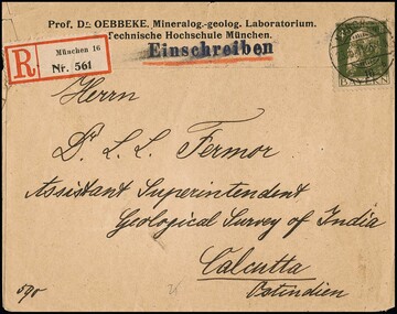40 Pfg. Luitpold einzeln auf R-Brief (dreiseitig geöffnet mit kleinen Papiermängeln) der 2. Gewichtsstufe von München 1911 nach Calcutta/Indien