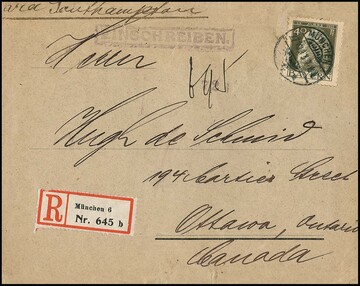 40 Pfg. Luitpold einzeln auf R-Brief von München 1913 nach Ottawa/Ontario, Kanada (Brief dreiseitig geöffnet), sowie Ganzsachenkarte 10 Pfg. (Bugspur) 1902 von Bamberg nach Montreal/Kanada