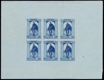 10 Mk. Luitpold 1911, blau auf bläulich, Essay-Kleinbogen von Alexander Fuks, mit sechs Werten, geschnitten auf Wasserzeichenpapier