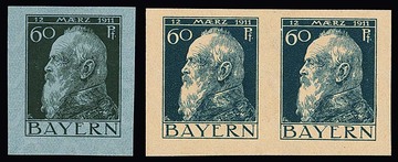 60 Pfg. Luitpold, geschnitten, auf weißem Kreide- bzw. farbigem Papier, gesamt 13 Probedrucke, u.a. in schwarz, schw./bläulich, grauviolett, blau, zwei Paare