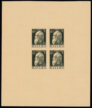 60 Pfg. Luitpold im geschnittenen Probedruck-Kleinbogen (re. Faltspur ausserhalb) zu vier Marken in schwarz auf beigem Papier