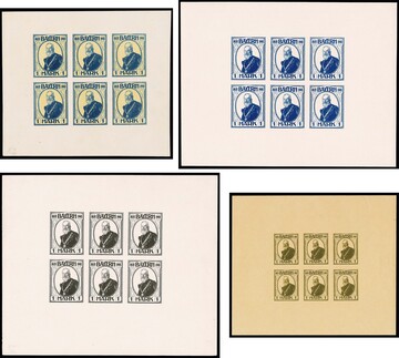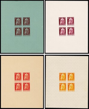 1 Mk. Luitpold, vier verschiedene geschnittene Essay-Kleinbögen zu je sechs Marken, einmal olivgrün im kleineren Format auf gelblichem Papier, sowie in braun, blau und blau/gelb auf weißem Papier im Großformat