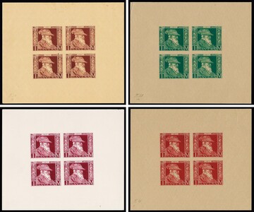 80 Pfg. Luitpold, vier verschiedene geschnittene Probedruck-Kleinbogen zu je vier Marken: lilarot auf bläulichem und auf weißem Papier, orange auf Wasserzeichenpapier, sowie orangerot