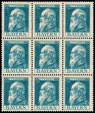 20 Pfg. Luitpold grünlichblau im, bis auf zwei Werte, postfrischen Probedruck-Neunerblock, gezähnt, mit leicht abweichender Inschrift ("1911" im Markenbild)