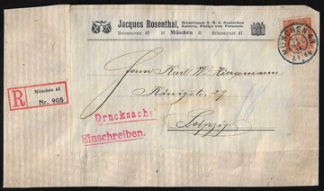 30 Pfg. einzeln auf Adresse einer R-Drucksache der 3. Gewichtsstufe aus München 1914, typische Gebrauchsspuren, gute Porto-Variante!