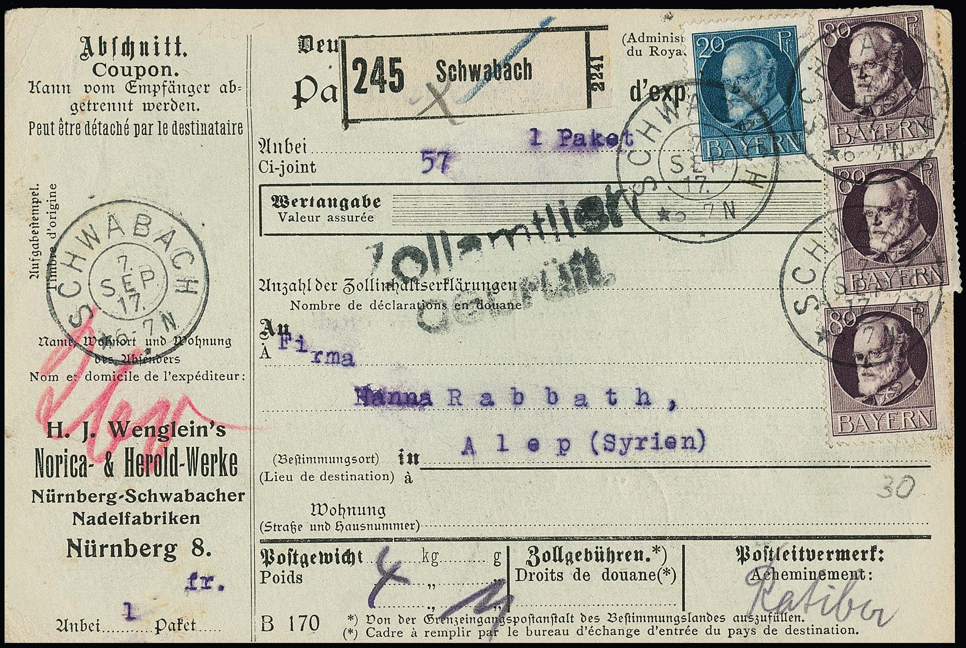 Zwei Paketkarten 1917 je nach Aleppo/Syrien, aus Schwabach bzw. Weissenburg, je typische Gebrauchserhaltung bzw. teils kl. Zf., Laufzeit infolge des 1. Weltkrieges zehn bzw. fünf Monate