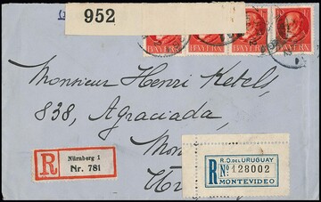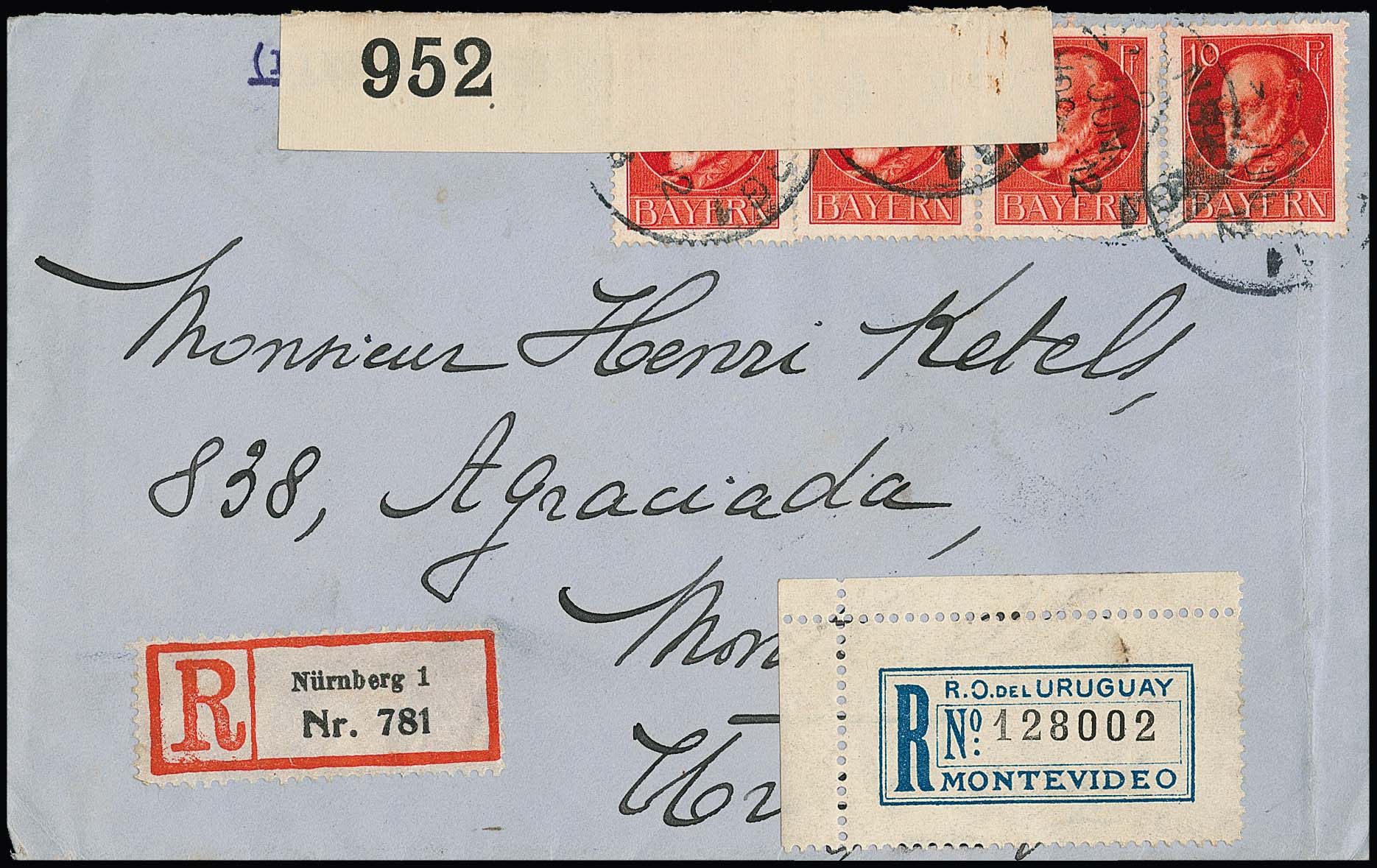 10 Pfg. per vier auf lila Damen-Einschreibebrief 1916 von Nürnberg mit Zensur nach Montevideo/Uruguay