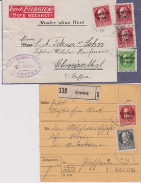 25 Pfg. Ludwig und 15 Pfg. "Volksstaat" auf Inlands-Muster-ohne-Werth-Paketkarte, sowie 5 und dreimal 10 Pfg. "Volksstaat" auf Adresse einer Expreß-Mustersendung (seltene Kombination)