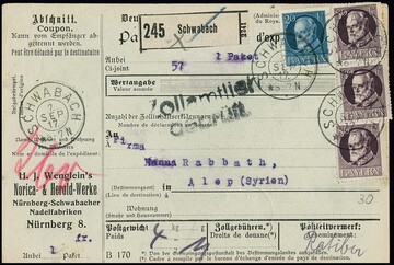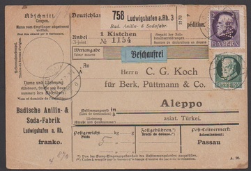 60 Pfg. und 2 Mk. je mit Firmenlochung "BASF" auf Paketkarte 1917 von Ludwigshafen nach Aleppo/Syrien, typische Gebrauchsspuren, Laufzeit infolge des Krieges sieben Monate!