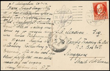 10 Pfg. orangerot einzeln auf Postkarte von München 1914 nach Singapur, Straits Settlements