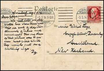 10 Pfg. Luitpold einzeln auf Postkarte (etwas fleckig) von Nürnberg 1914 nach Auckland/Neuseeland (25.000km entfernt!)
