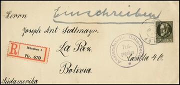 40 Pfg. Ludwig einzeln auf Zensur-R-Brief 1916 von München nach La Paz/Bolivien, auch "so spät" noch eine sehr seltene Destination!