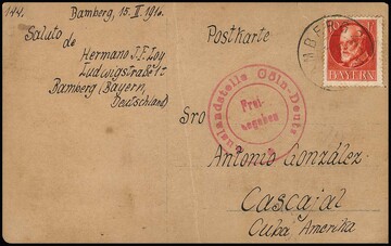 10 Pfg. Ludwig je einzeln auf zwei Zensur-Postkarten 1916 nach Cuba, einmal von Bamberg nach Cascajal (Kartenformular kl. Mgl. wie Bug, aber seltener Ort im "Hinterland"), sowie von Schrobenhausen nach Havanna
