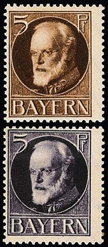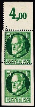 5 Pfg. Ludwig im senkrechten Oberrandpaar (postfrisch, nur im Oberrand Falz), obere Marke (natürliche Druckfalte) teilgezähnt, untere ungezähnt, sign. Pfenninger