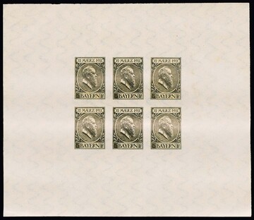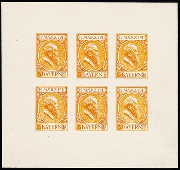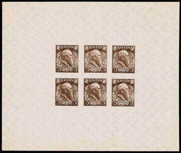 5 Pfg. "BAYERN 1911", Luitpold, kpl. Essay-Kleinbogen zu sechs Marken in braunorange auf dickem Kreidepapier (von Peter Hahn)