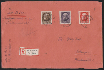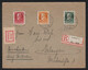 Sieben bessere Belege: Orts-R-Brief mit Nr. 94B, 100B u. 111B, ferner Nr. 98Ib als EF auf Feldpost-Paketkarte (2), Nr. 99B, 102B, 114B auf Eil-R-Brief, Nr. 100, 113 u. 114A(2) auf Expreß-R-Brief "eigenhändig", Nr. 101IIB als EF auf R-Brief, sowie Nr. 104-6B auf Wertbrief