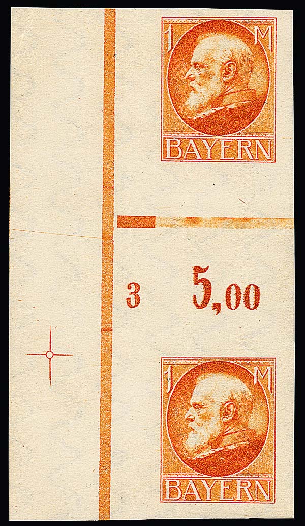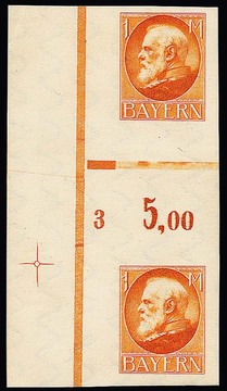 1 Mk., die Variante "ohne Aufdruck" im ungebrauchten senkrechten Zwischenstegpaar, untere Marke Pl.-Nr. "3", in dieser Variante selten (Mi. nicht gelistet!)