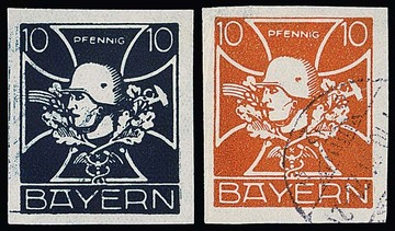 10 Pfg. Stahlhelm, zwei Entwürfe in dunkelblau und dunkelocker (mit Gef.-Stempel)