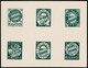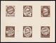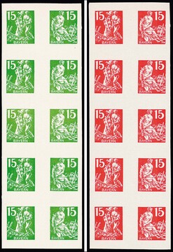 15 Pfg. Pflüger/Bäuerin, Entwürfe von Prof. Engels, fünf Zehner-Zusammendruckbogen in grau, gelborange, rot, grün und blau, sowie ein Paar in schwarz