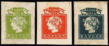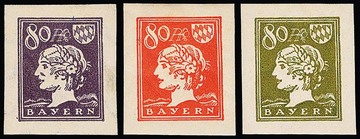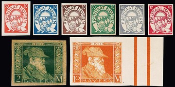 Freimarkenserie "Raute und Löwe", Essays von Franz Adler 1919, jeweils sechs Probedrucke in Wertstufen von 5 bis 30 Pfg. in den Farben orangerot, blau, braun, grün, violett und karminrot, gesamt also 36 verschiedene
