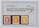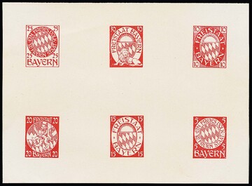 "Raute und Löwe", 1919, vier verschiedene Essay-Kleinbögen von Franz Adler mit Wertstufen von 5 bis 30 Pfg. in rot, lila, dunkelgrün und braun, als kpl. Sechser-Kleinbögen selten, ein Attest APS