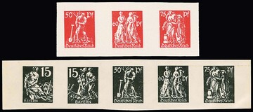 "Bauer und Bäuerin", die Essays von Robert Engels 1920, einmal der "Ur-Streifen" in schwarz mit 15/15/50/60/75 Pfg. als Zusammendruck, sowie der Zusammendruckstreifen 50/60/75 Pfg. in rot, grau, gelbgrün, gelborange und blau