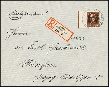Vier bessere Belege: Nr. 154B im Paar als MeF, 160A als EF auf R-Drucksache, 161B vom Rand als EF auf R-Brief, sowie Nr. 184-86 auf Eil-NN-Wertbrief, teils sign. Infla