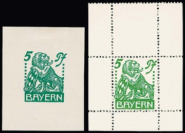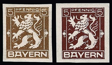 "Bayerischer Löwe", 5 Pfg., fünf versch. Essays von Johann Wurstl 1919 auf gummiertem Papier in braunoliv, hellbraun, braunrot, blau und blauviolett, je sign. Ludin