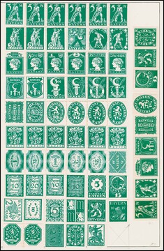 Bayern-Abschied, 68 meist verschiedene gezähnte Entwürfe, alle in grün, teils in Zusammendruck-Einheiten, auf Vorlageblatt, siehe Foto, selten