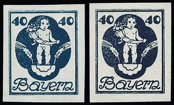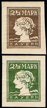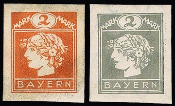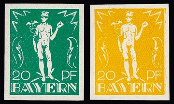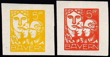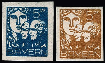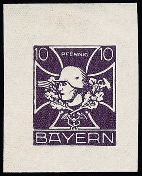 5 Pfg. "Bavariae und Stahlhelm", vier Essays von Johann Wurstl 1919 im Großformat in orangerot, gelboliv, hellbraun und grauviolett auf gummiertem Papier, sign. Ludin